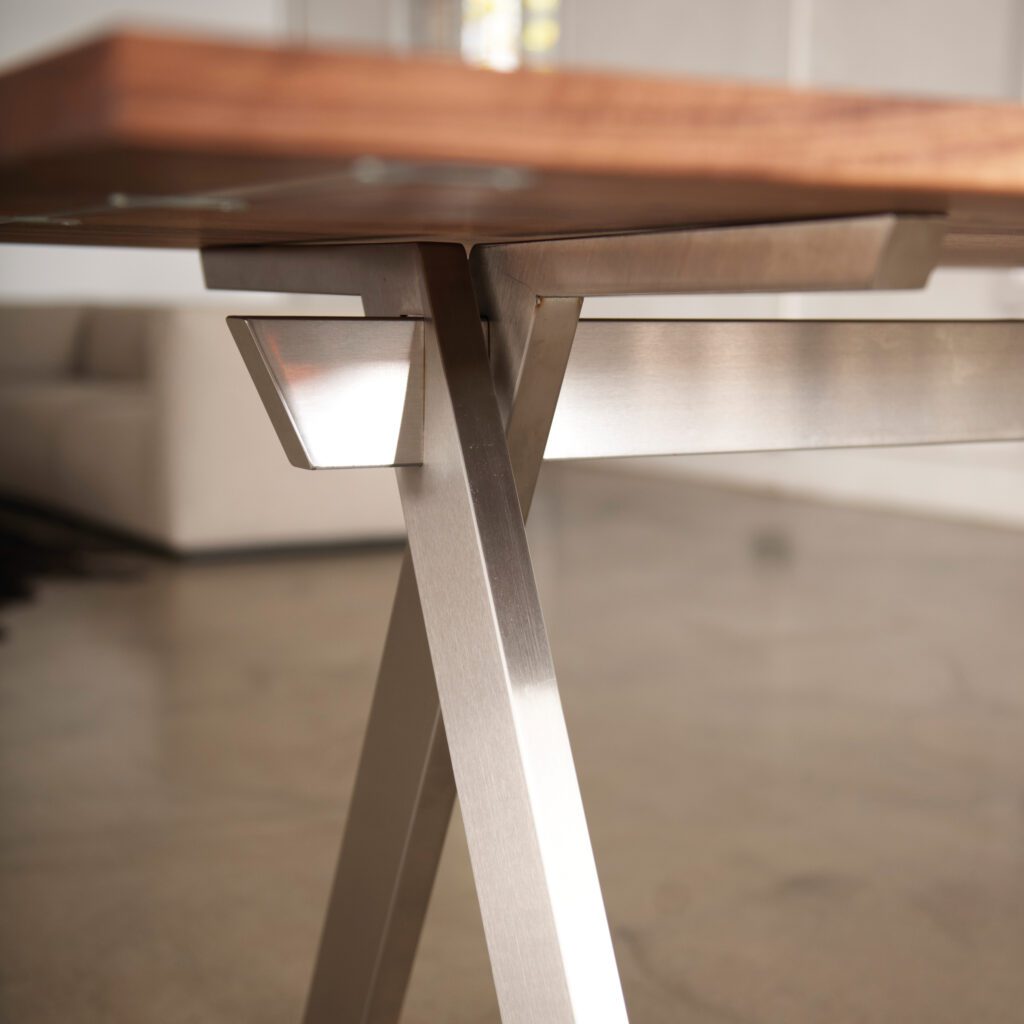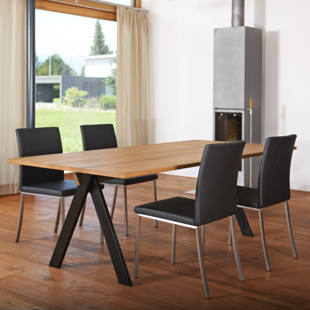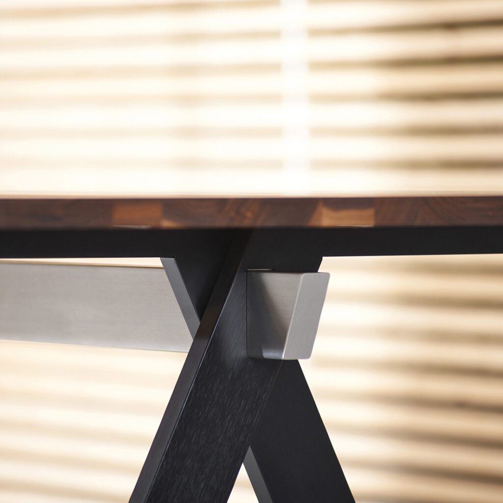 Das leichte Erscheinungsbild des LEX ist eine echte Bereicherung für jegliche Lebensräume, Begegnungszonen und Arbeitsbereiche. Die wahlweise nach oben verjüngten Längskanten der Massivholzplatten unterstützen die Linienführung des Tischunterbaus. Das spezielle Design des X-Fusses ermöglicht den Genuss einer absoluten Beinfreiheit.