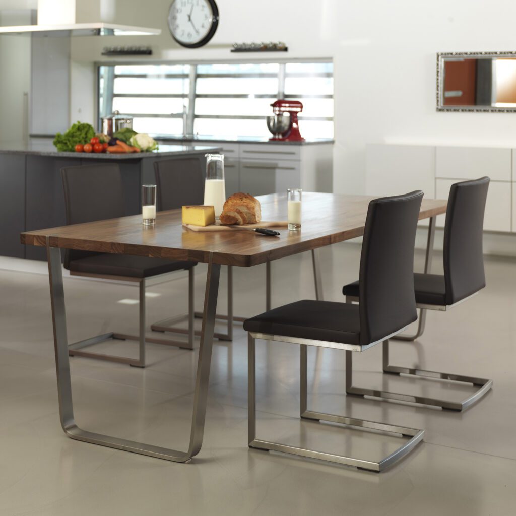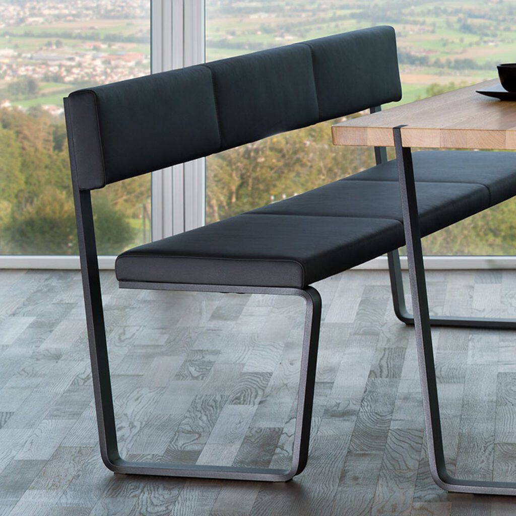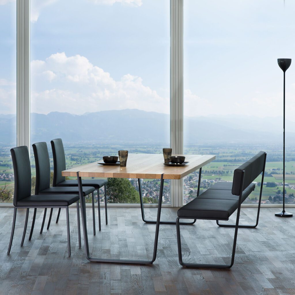 Die Tischfüsse sind nach innen versetzt und können in geschliffenem Edelstahl oder in pulverbeschichtet RAL gewählt werden. Die Kufe wirkt massiv und doch leicht. Eine Weltneuheit ist die Wohnbank MOMENTUM, die als Freischwinger konzipiert wurde. Die klare und dennoch weiche Optik passt sich geschmeidig den fliessenden Bewegungen des Tisches an und macht die beiden fast unzertrennlich.