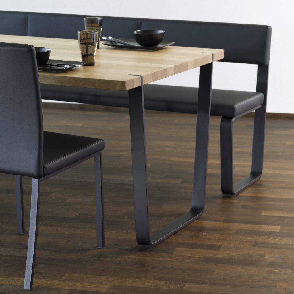 MOMENTUM – Standhaft und doch mit Schwung und Leichtigkeit. Diese Attribute wurden im Erscheinungsbild von Tisch und Bank vereint. Der leichte Schwung & die Winkelstellung der Kufen finden sich auch im Radius der Tischplatte wieder.